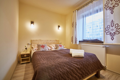 - Apartament większy zawiera dwie dwuosoobowe sypialnie.